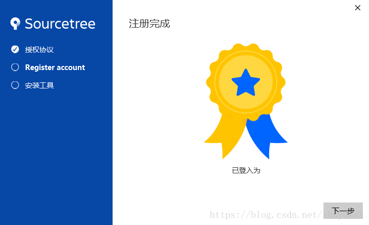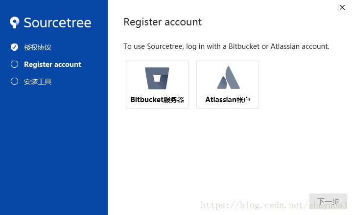 今天安装sourcetree一直卡在注册界面,注册并登陆成功后,也无法继续安装