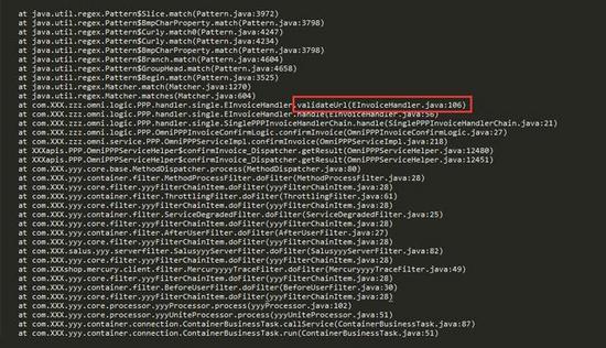 我们可以看到所有的堆栈都指向了一个名为 validateurl 的方法,这样的报错信息在堆栈中一共超过 100 处。通过排查代码,我们知道这个方法的主要功能是校验 url 是否合法。