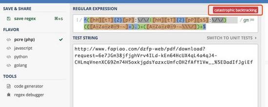 例如我本文中存在问题的那个 url 使用该网站检查后会提示:catastrophic backgracking(灾难性回溯)。