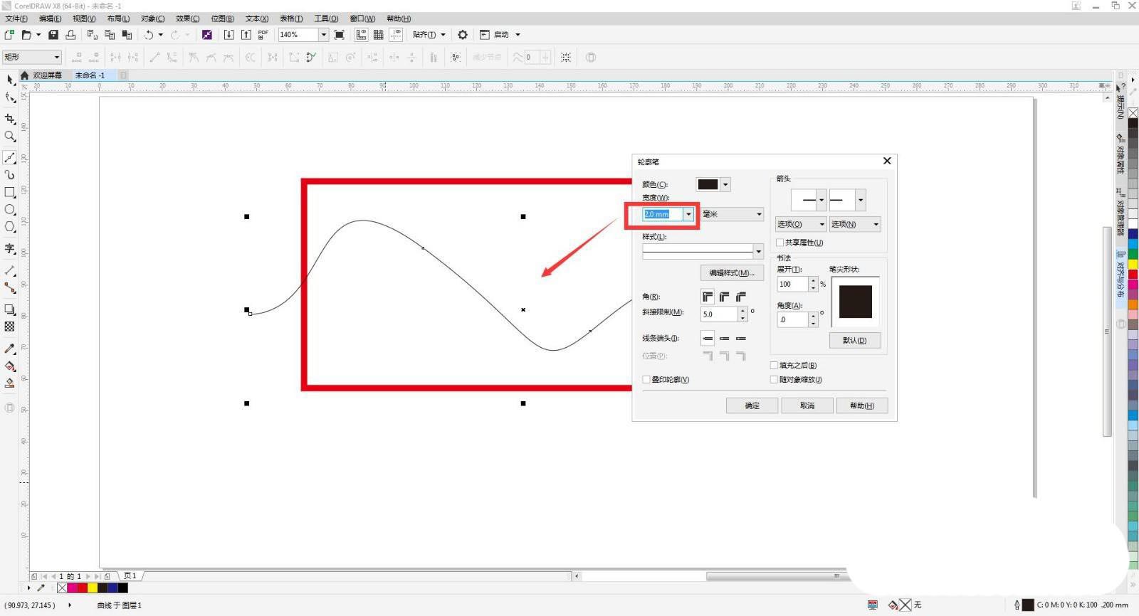 现在用鼠标左键点击右边的颜色更改矩形的颜色,再点击贝塞尔工绘制图形,按f12调出轮廓笔工具,调整轮廓粗细点击确定。