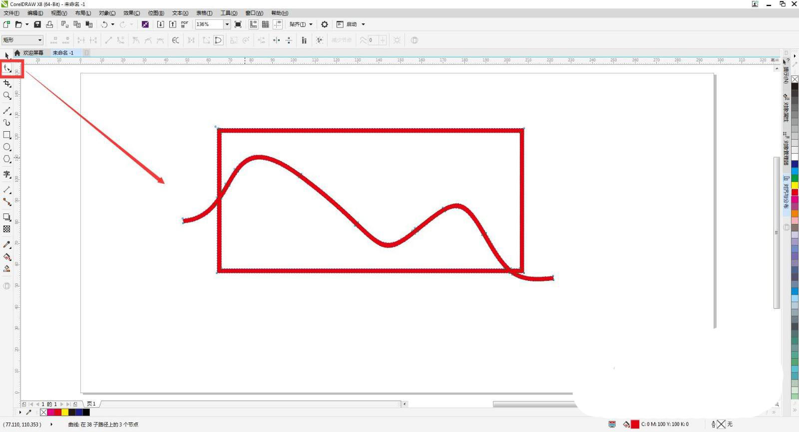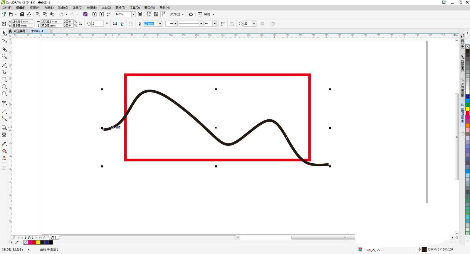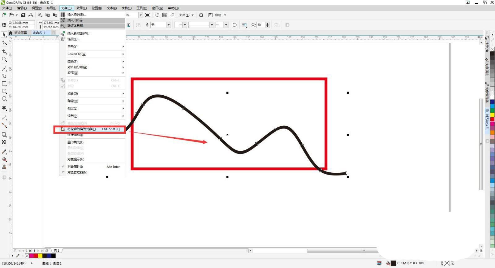 点击曲线按ctrl+shift+q键将轮廓转化为对象,再点击右边的颜色更改曲线颜色,现在框选两个图形点击合并,再点击形状工具或者按f10键把不要部分框选出来按delete键删除。