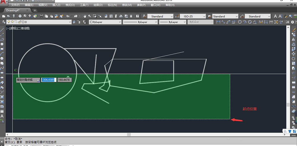 左键点击对角点(1)由左往右的选择-->“框选住全部才能选中对象”-->"蓝色框"。