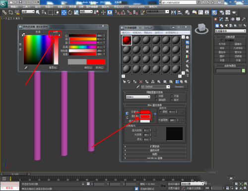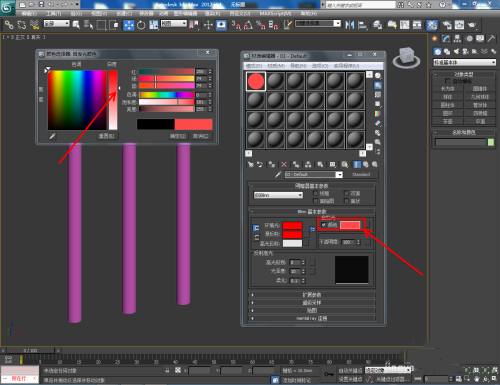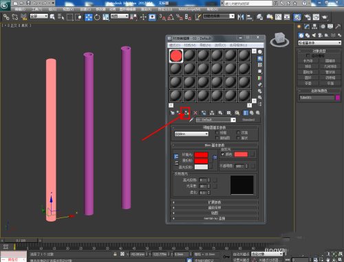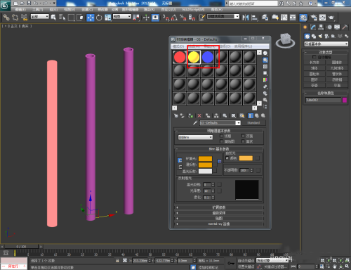 3、点击【材质编辑器】,弹出材质编辑器设置栏,按图示参数设置出一个红色发光材质球并将其附加管状体1;