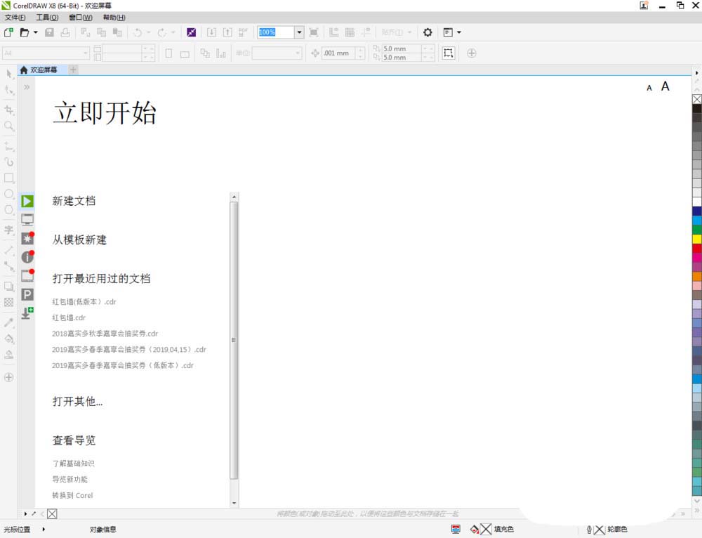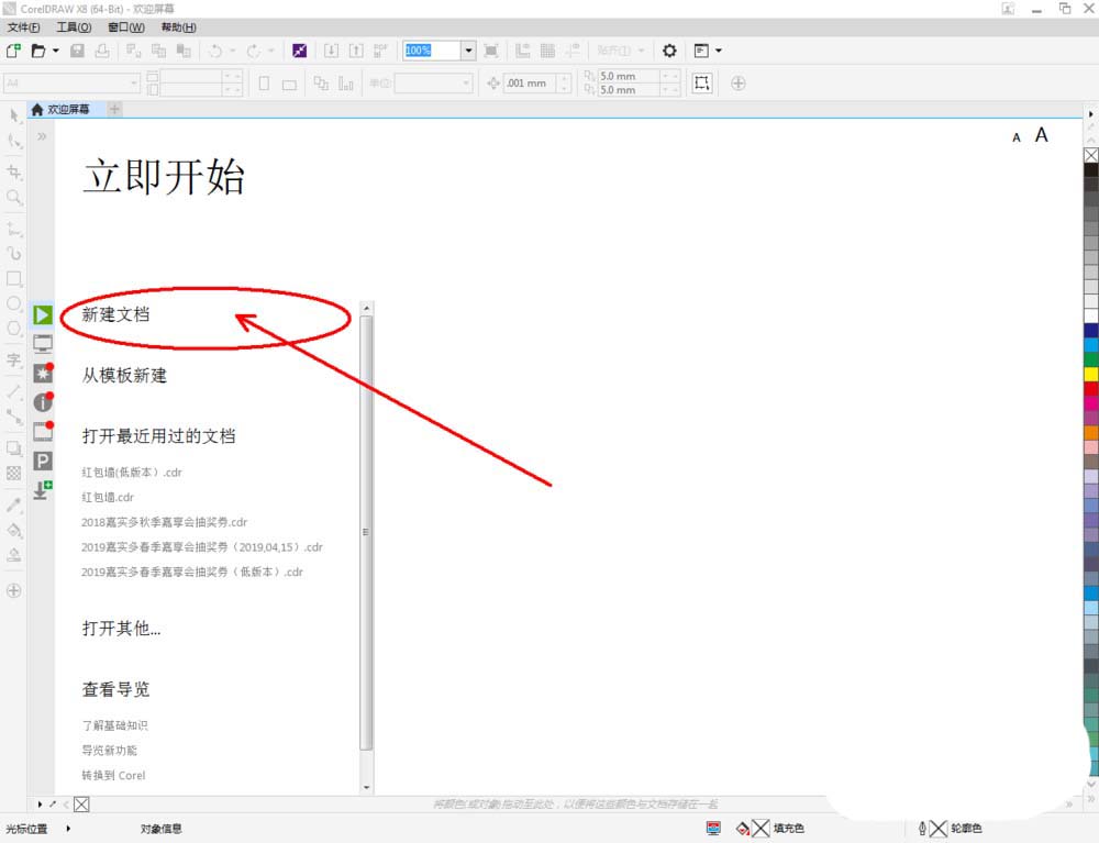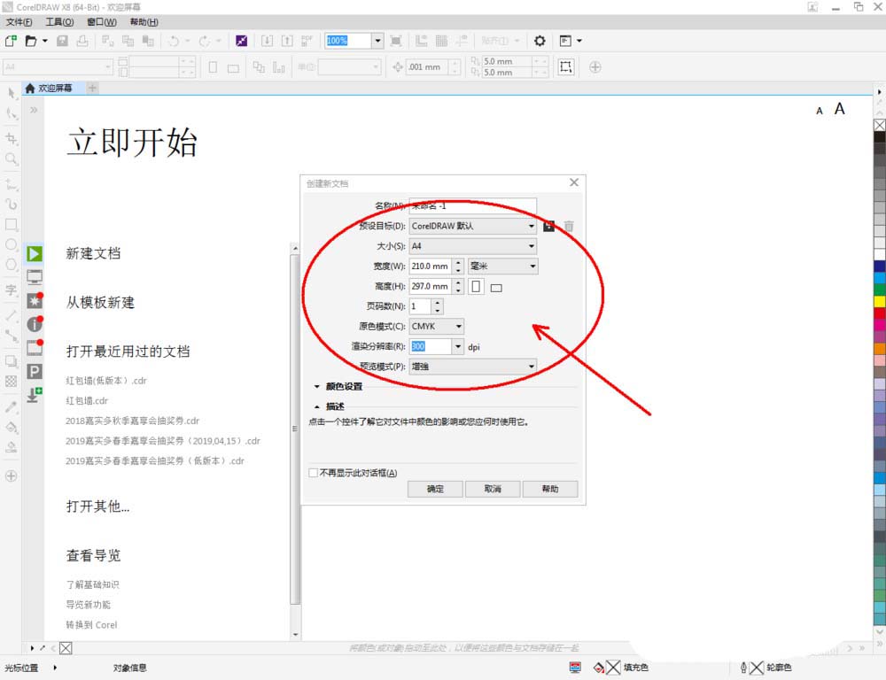 1、打开coreldraw x8 软件,点击【新建文档】,按图示参数新建一个cdr文档(如图所示);
