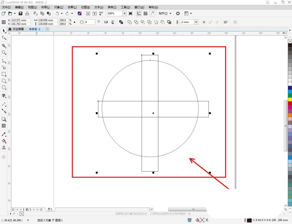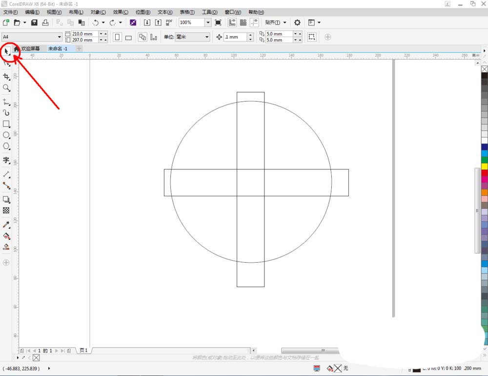 2、点击【椭圆形工具】在作图区域绘制一个圆形图案后,点击【矩形工具】绘制出一个横向矩形图案和一个纵向矩形图案。完成后,调整好图案间的位置关系(如图所示);