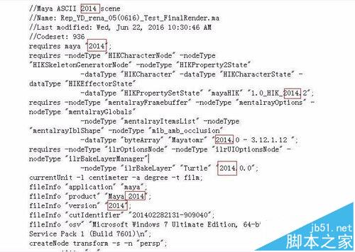 2、只有一种方法比较实用,可以先将maya文件保存为.ma文件,然后以记事本或者写字板的方式打开,将代码中的2015替换为2014即可!如图