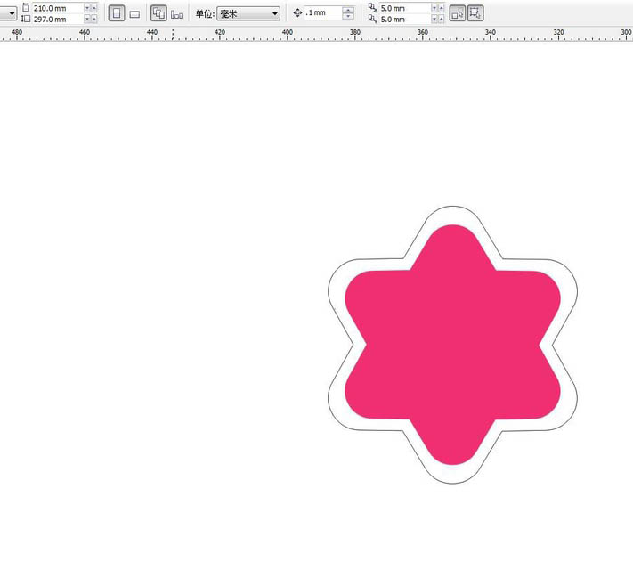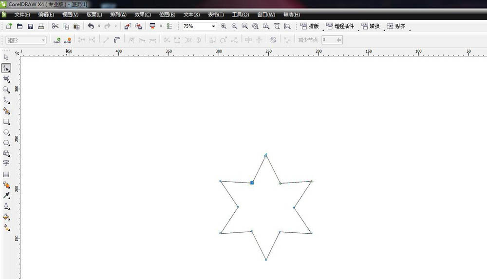 3、选择形状工具调节节点。在属性栏中选择形状工具,然后选择一个节点向里拖动,变为尖角的六角星的样式