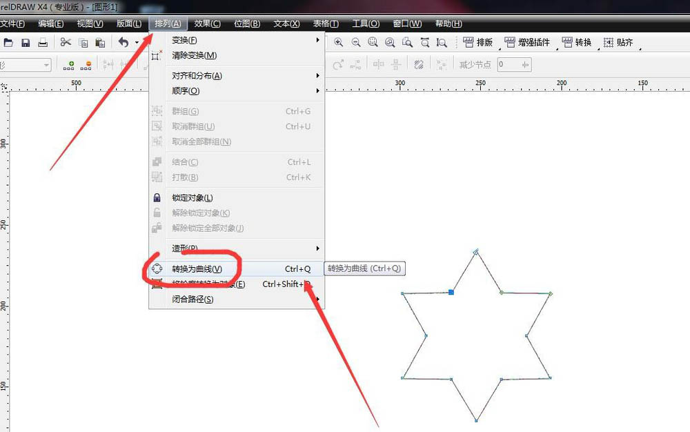 4、转化为曲线。选择图形,在排列菜单栏中选择转化为曲线,也可以使用快捷键ctrl+q