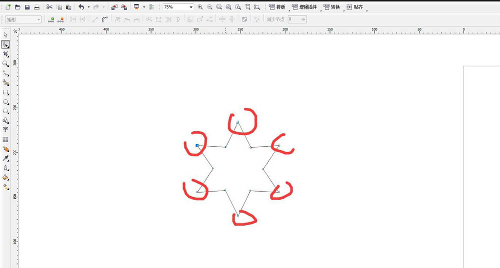 5、选择外圈的节点。用形状工具选择节点,按住shift键可以加选,直到选择外圈的六个节点位置