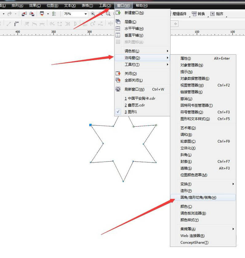 6、调出圆角面板。在窗口菜单栏中选择泊坞窗——然后选择扇形角圆角倒棱角,调出圆角面板