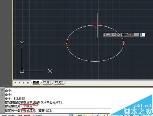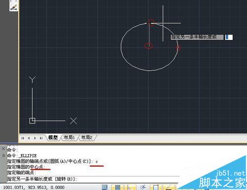 3、在点击椭圆命令后,输入栏出现:指定椭圆的轴端点或[圆弧(a)/中心点(c)]:这里讲解一下中心点绘制。点击椭圆命令,输入c回车,绘图区点击一点,点击长轴的另一端点,移动鼠标点击短轴端点得到椭圆。