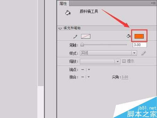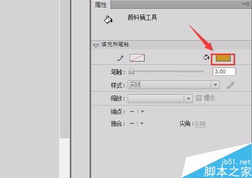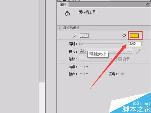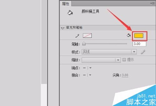 11、在工具箱里选择油漆桶工具,在属性里修改填充色为深一点的黄色,如图所示: