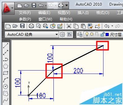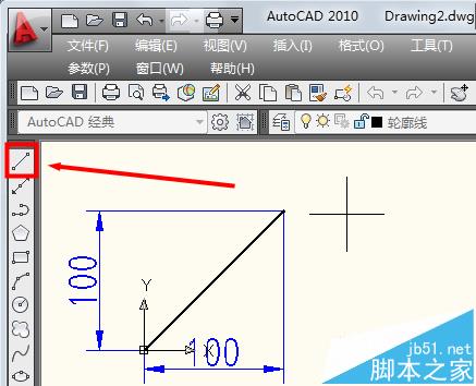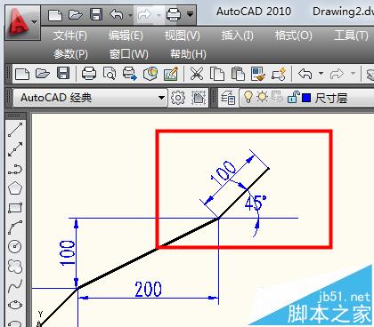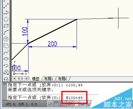 3、相对坐标还有一种画角度的方法,如果输入"@100<45"。