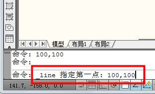 4、此时cad直线的第一点就定位在绝对坐标“100,100”处了。