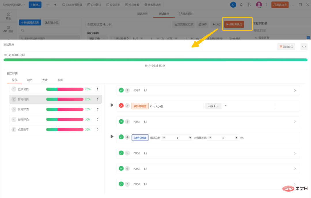在测试用例中一眼就可以看到可以添加条件控制器、次数控制器/while控制器、等待控制器、全局断言、脚本, 需要用到哪一个控制器直接使用就行,执行后可以看到各个接口的测试进展和测试结果,全程可视化操作,不需要敲代码就可以实现!