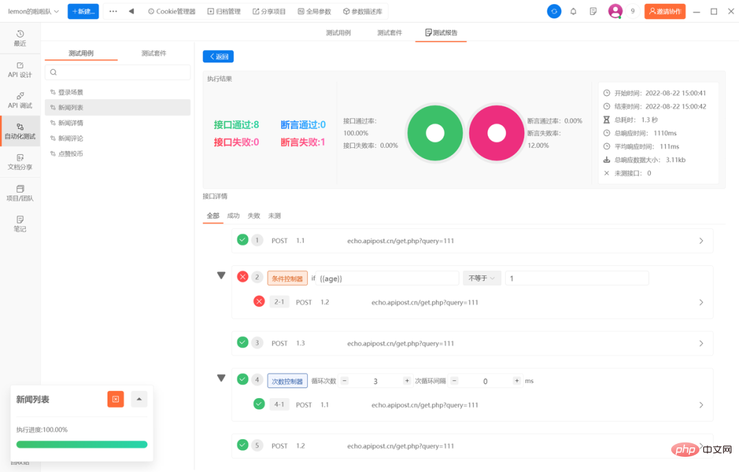 测试报告也是很贴心的功能了。测试报告会在测试完成后直接生成,可以详细的看到测试结果和接口信息,以及可以直观的看到哪些接口成功了,哪些接口失败了,并且可以快速定位到bug的位置所在。