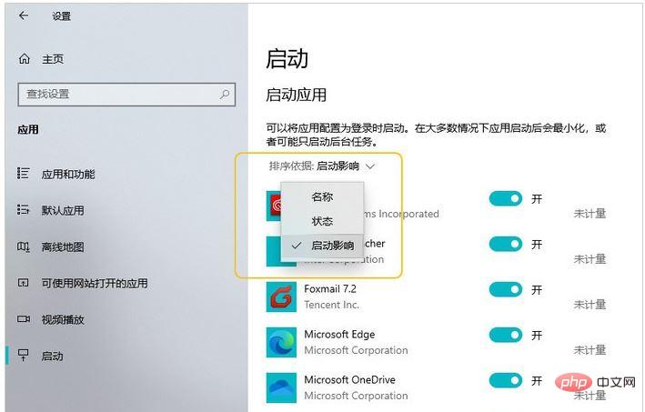打开“设置”→“应用”→“启动”,可以看到当前系统中的所有启动项目。除了直接关闭以外,我们还可以点击左上角“排序依据”,根据影响程度大小,快速找出拖慢你电脑的“罪魁祸首”!
