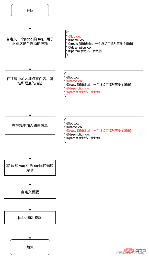 我们知道,JSDoc 可以根据代码中的注释输出一份文档。首先我们自定义一个 JSDoc 的 tag 来标注这是一个埋点的注释,这样后续处理时可以过滤掉其他注释的干扰。结合具体项目中使用的代码可以画出这样一个流程图: