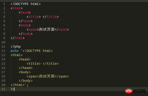 2、这样书写一些现代文本编辑器(如SublimeText)将无法对引号包围的输出的内容进行语法着色,如果出现一些格式问题将极难发现。图中为SublimeText3的一张截图,上面的是正常的着色,下面则是用引号包围的着色