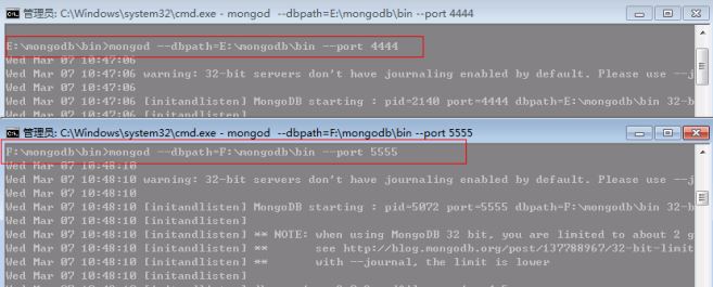 对分片来说,也就是要添加片了,这里开启E,F盘的mongodb,端口为:4444,5555。