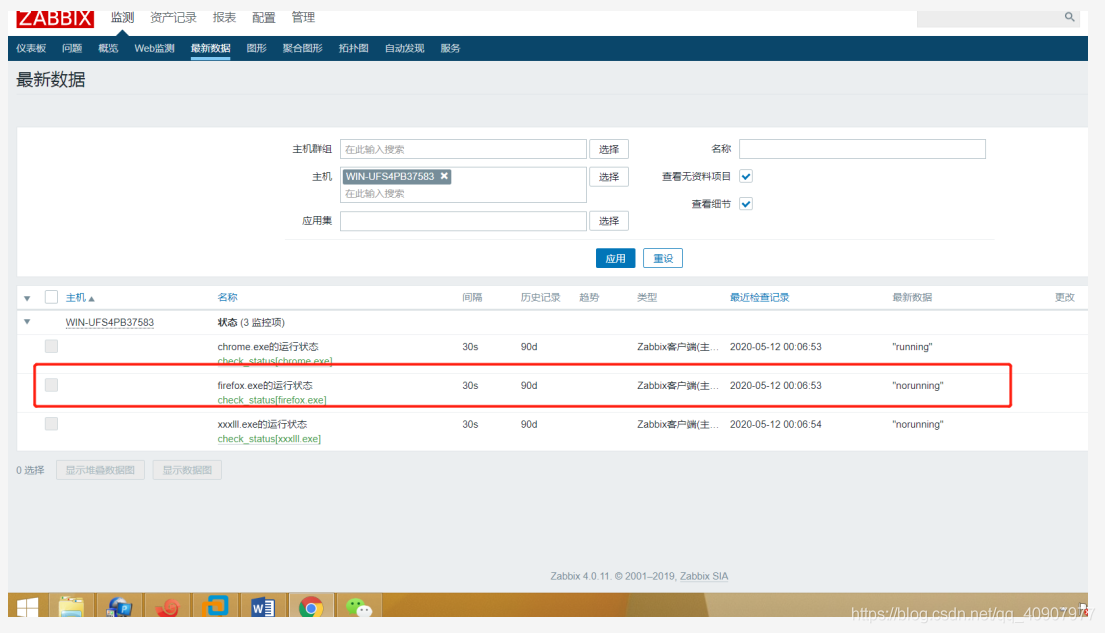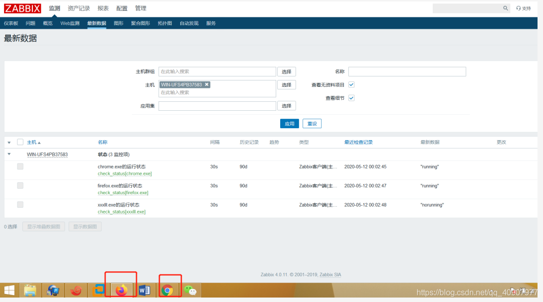 自动发现填入了三个exe程序名,其中xxxll.exe为不存在的exe,为了验证效果,现在把firefox.exe程序关掉,看一下他的最新数据是否会显示成norunning。