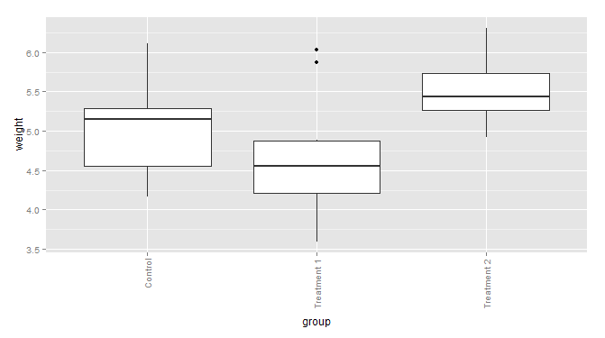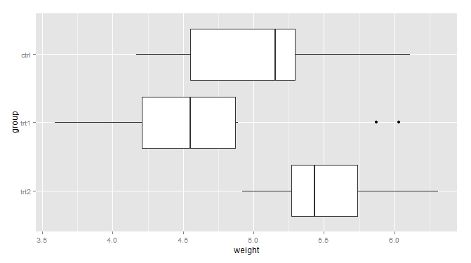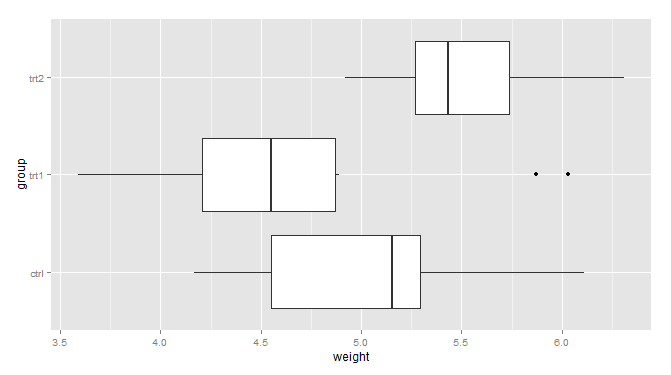 library(ggplot2) library(gcookbook) ggplot(plantgrowth, aes(x=group, y=weight)) + geom_boxplot() ggplot(plantgrowth, aes(x=group, y=weight)) + geom_boxplot() + coord_flip()