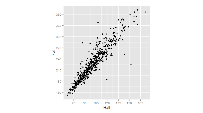 sp <- ggplot(marathon, aes(x=half,y=full)) + geom_point() #1:1 sp + coord_fixed() + scale_y_continuous(breaks=seq(0, 420, 30)) + scale_x_continuous(breaks=seq(0, 420, 30)) #1:2 x轴刻度长度比y轴刻度长度 sp + coord_fixed(ratio=1/2) + scale_y_continuous(breaks=seq(0, 420, 30)) + scale_x_continuous(breaks=seq(0, 420, 15))