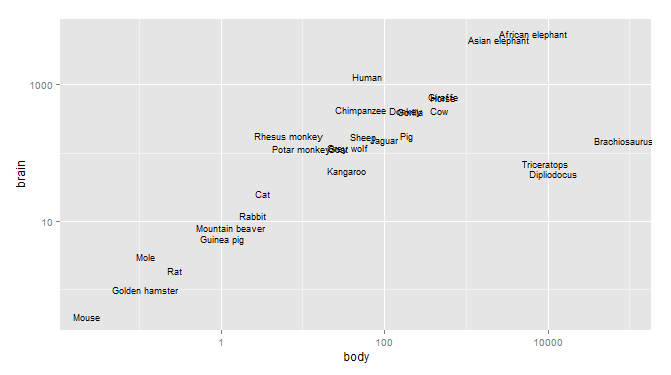 library(mass) p <- ggplot(animals, aes(x=body, y=brain, label=rownames(animals))) + geom_text(size=3) #只显示标签线 p + scale_x_log10() + scale_y_log10()