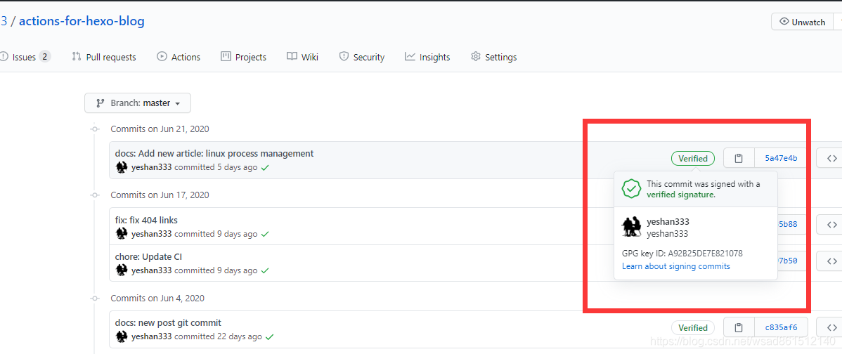 我们可以看到,是可以 push 到 github 的[没有小绿标而已]。这看起来就不太好,得让 github 证明下自己得身份才行,从官方文档可以看到, github 提供了一种使用 gpg 的方式可以让我们的 commit “戴”上小绿标。