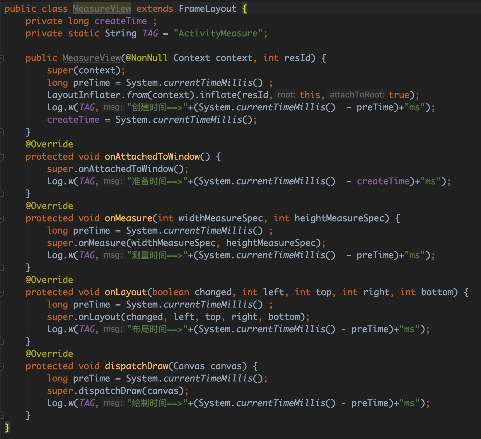 测量过程耗时占比也比较客观,有43ms之多(26%),虽然“准备时间”的耗时多于测量,但是这部分主要是WMS和ViewRootImpl之间通信的消耗,我们无法直接进行优化。