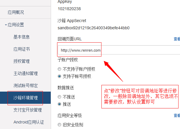 2、在应用管理页找到对应应用,点“沙箱环境管理”进入沙箱管理页面。该页面可获取沙箱环境appkey、appsecret 及配置回调地址等。