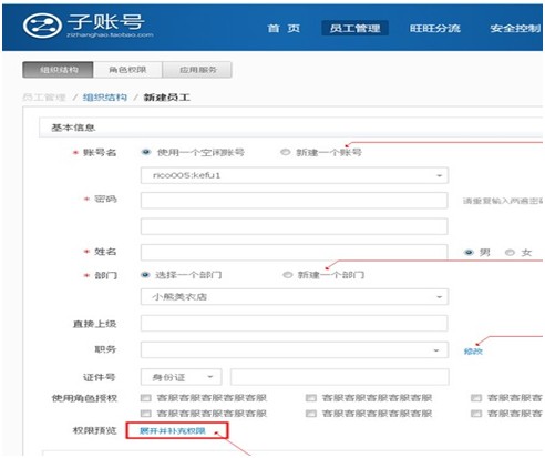 进入“卖家中心—子账号管理—员工管理—组织结构”,选中你要编辑的员工子账号或新建员工:
