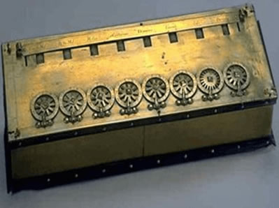 如图 3 所示,从外形上看,帕斯卡林计算器就是一个装有很多齿轮的箱子,当一个齿轮转动时,会带动相邻轮子转起来。每个轮子顶部都设有一个窗口,用来读取数值。