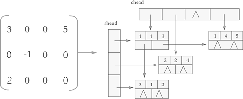 可以看到,使用十字链表压缩存储稀疏矩阵时,矩阵中的各行各列都各用一各链表存储,与此同时,所有行链表的表头存储到一个数组(rhead),所有列链表的表头存储到另一个数组(chead)中。