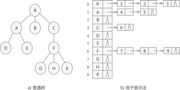 例如,使用孩子表示法存储图 1a) 中的普通树,则最终存储状态如图 1b) 所示: