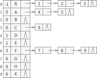 其实,我们还可以将双亲表示法和孩子表示法合二为一,那么图 1a) 中普通树的存储效果如图 2所示: