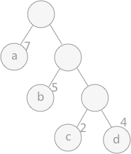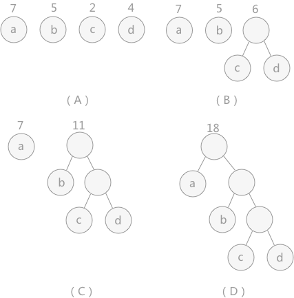 图 2 中,(A)给定了四个结点a,b,c,d,权值分别为7,5,2,4;第一步如(B)所示,找出现有权值中最小的两个,2 和 4 ,相应的结点 c 和 d 构建一个新的二叉树,树根的权值为 2 + 4 = 6,同时将原有权值中的 2 和 4 删掉,将新的权值 6 加入;进入(C),重复之前的步骤。直到(D)中,所有的结点构建成了一个全新的二叉树,这就是哈夫曼树。