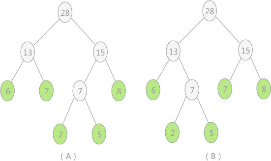 }注意,如果使用此程序,对权重值分别为 2、8、7、6、5 的节点构建哈夫曼树,最终效果如图 4(A) 所示。但其实,图 4(B) 中显示的哈夫曼树也满足条件,这两棵树的带权路径长度相同。