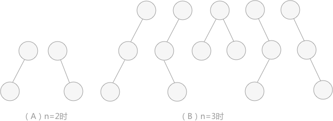 最直接的一种方法就是推理。当 n=0 时,只能构建一棵空树;当 n=2 时,可以构建 2 棵形态不同的二叉树,如图 1(A);当 n=3 时,可以构建 5 棵形态互不相同的二叉树,如图 1(B)。