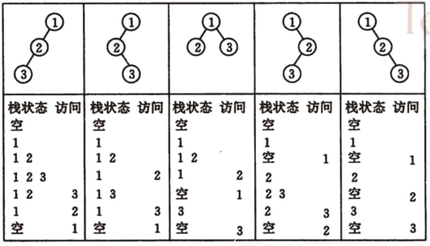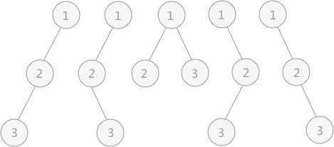 如图 3 所示为前序序列(1,2,3)构建的不同形态的二叉树,他们的中序序列各不相同。所以不同形态二叉树的数目恰好就是前序序列一定的情况下,所能得到的不同的中序序列的个数。